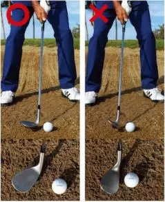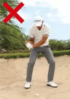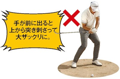 バンカーショットで、芝の上からのアプローチのように上から球を直接打とうとしてハンドファーストに構える人がいますが、これは絶対にNG!手前の砂に突き刺さって「大ザックリ」です(笑)。