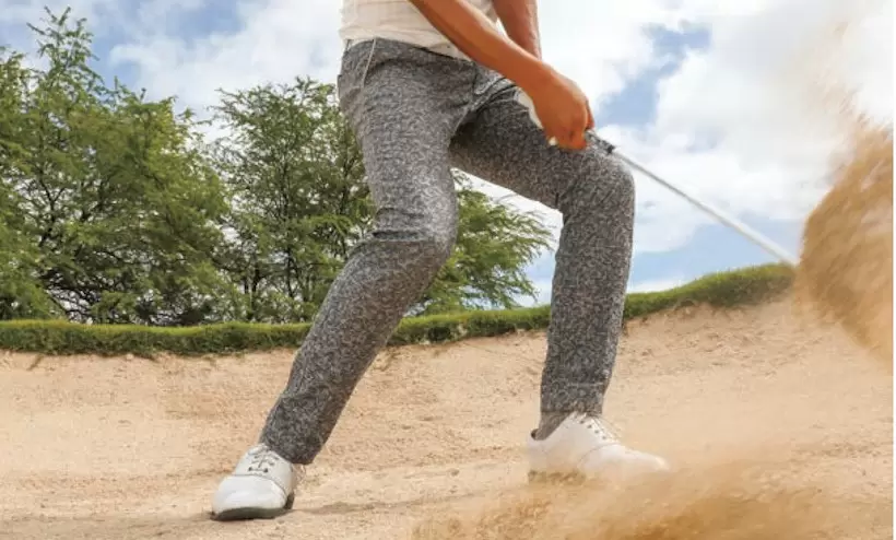 手前の砂ごと払い打つのがバンカー成功の秘訣。手を右足寄りに置くのがポイント。