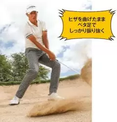 手は球の後ろ、右足寄りにセットするのがバンカーショットの掟。手前の砂ごと払い打てるので、スムーズに振り抜けて一発脱出できるはずです。