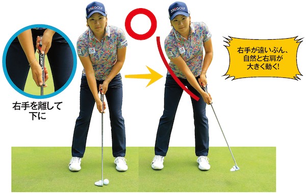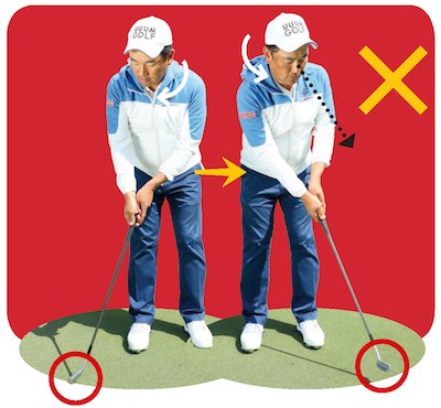 こうなるとフェース向きが変わってしまい引っかけたり、押し出したりすることになります。これを防ぐためには肩でストロークする意識を強くもつことがとても重要です。