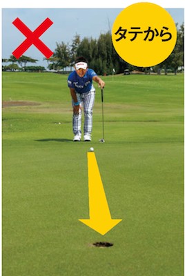 その場合はグリーンの一番高いところからの傾斜がどうなっているかを見つけて、その傾斜がもっとも強く影響していると考え、打つラインを自分なりに見つけましょう。そして見つけたラインが間違っていたとしても、迷った末に、どう打っていいのかがわからないまま打つよりも、必ず結果はよいはずです。