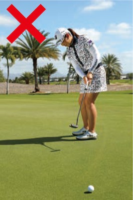 下半身のムダな動きは軸のブレに直結するため、ボールをパターヘッドの芯で捉えることが難しくなります。これでは方向性はもちろんのこと、距離感も合わなくなります。したがって、ロングパットも必ず下半身は不動の意識をもちましょう。