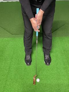 ボールを真っすぐコロがすポイントはパターヘッドの芯とボールの芯を衝突させることです。パターヘッドを地面から少し浮かした状態でアドレスし、そのままストロークをはじめれば、芯同士が衝突します。