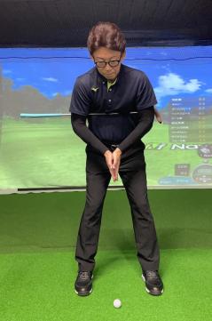 カラダとボールの位置を合わせたら、フェース面を打ちたいところへ向けます。このとき肩、腰、ヒザ、足の向きがフェース面と合っているかもあわせてチェックします。