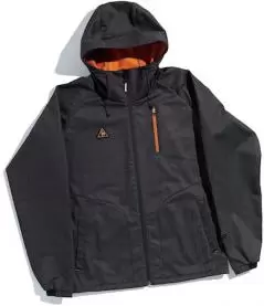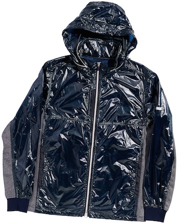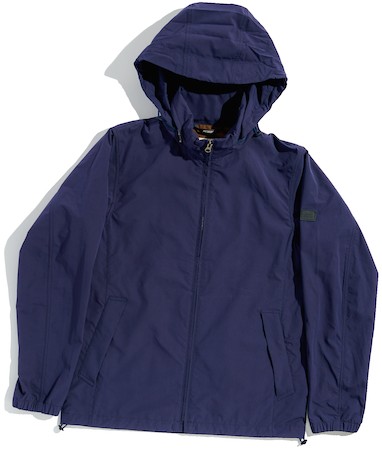薄いながらも撥水性に優れ、しなやかさとタフさを両立した高機能素材がメイン。サイドやソデの一部に用いた異素材が、大人感をプラス。フードは収納式。