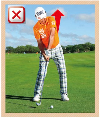 ▼体が伸びてヘッドが地面に届かず、球の上っ面を叩いてしまう