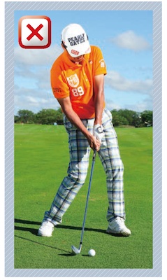 よくあるアイアンのミスの中でも、地ベタから打つクラブならではの最大の悩みがダフリ。どうしても球を上げようとして体重が残って、手前の芝を叩きがち……。だが、強制的に左に乗って、その状態で打つ感覚をつかめばすぐ直る!