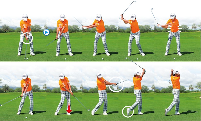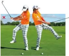 バックスイングでは右足1本に、フォローでは左足1本に乗る「ステップ振り」を繰り返すことで、確実に左に乗って振る理想的な体重移動をマスターできる。