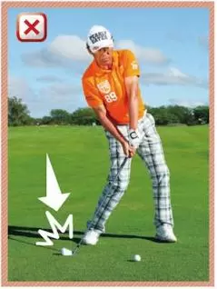 ▼右に体重が残って上体が傾くことで球より手前にヘッドが落ちる