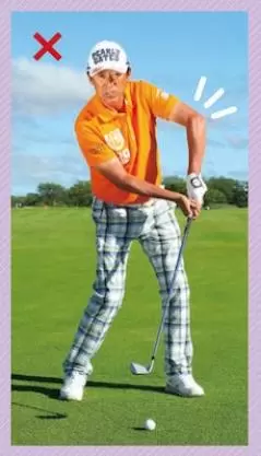 ▼左ワキが開くことでリスト(手首)が返らず、フェースも開いたまま当たってしまう