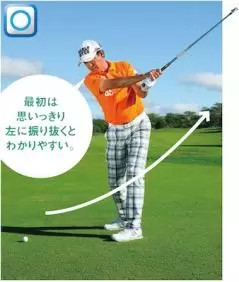 体の横でクラブを立ててL字を作るのが理想だが、最初は意図的に左に振ってみると手首が返る動きを体感しやすい。
