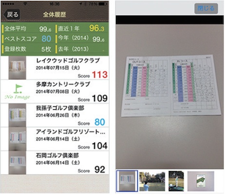 自分だけではなく同伴者のスコアを写真付きで登録でき、コース名や天気なども記録。さらに平均スコア、平均パット、パーオン率やフェアウェイキープ率、ボギーオン率などのスコア分析機能が充実している。SNSへ写真付きスコアの投稿も可能。