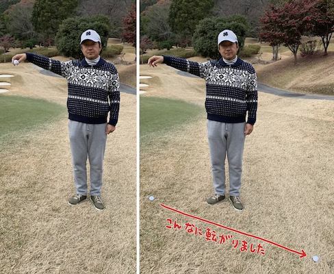 分かりやすいようにボールが落ちた地点にもボールを置いていますが、斜面なのでこのくらい転がってしまいます。ラフの低い部分ってけっこうライが悪かったりすることも多いので、これだと芝の薄いところまで転がってしまうかもしれませんね。何回か試しましたが、このドロップで斜面の上の方に止めることは無理でした。