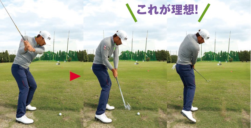手元が下がれば、ヘッドはボールに対してダウンブローに下りていく。