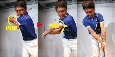 ▼小平智の左腕は、バックスイングで内旋したのと同じぶんだけダウンスイングで外旋している。