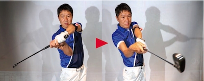 アマチュアの多くは、このように左腕を戻しきれない。それは、フェースが開いてインパクトしているということになる。