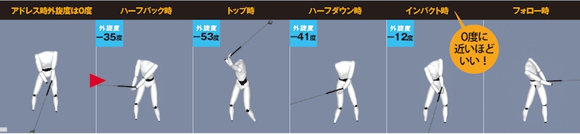 「外旋させないと、フェースが開いてインパクトを迎えやすくなります。そのため、小手先で調整して当てるしかなくなります。さらに、ぶ厚いインパクトにおいて重要な入射角が、ダウンブローになりません」(宮川)