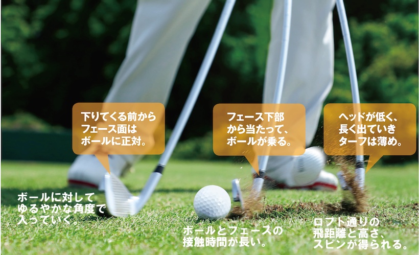 芯でとらえたロフト通りの当たりになるので、飛距離も出れば、高さも出るし、理想的なスピン量が得られる。