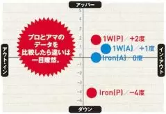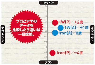 ※タテ軸は上下入射角、ヨコ軸はヘッド軌道。アマチュアの数値は、早川さんのデータの平均、プロの数値は小平智の2017年に測定したもの。ヘッド軌道の数値は省略しています。