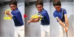 小平智の左腕の外旋を見習うことによって、適正な入射角が得られる。アイアンのぶ厚いインパクトにおいては、入射角がマイナスであることが肝要だ。