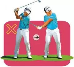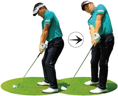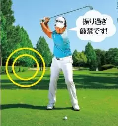 大振りするとトップで体が左に傾き、また強く打とうとするとダウンスイングで体の軸が右に傾く。こうなったら動き過ぎと心得よう。