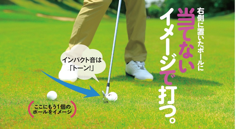 大事なのは右腰の高さを保って打つこと。それにはボールの右にもう一つのボールをイメージし、それに当てないように打つのがいい。プライベートのラウンドなら実際にボールを置いてみましょう。
