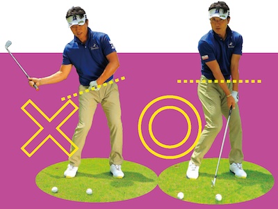 インパクトでヘッドが下から入るのがぶ厚く当たらない原因。ダウンスイングで体の軸が右に傾くのを抑え、ヘッドの入り口を意識するのが稲森流だ。