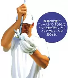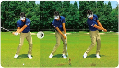 インパクトが薄くなるのは、インパクトに向かってヘッドが下から入るから。打つ以上、ある程度ボールに向かって行く必要がありますが、 多くのアマチュアはボールから離れていくように振っている。そのためヘッドが下から入るのです。