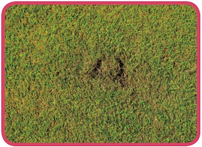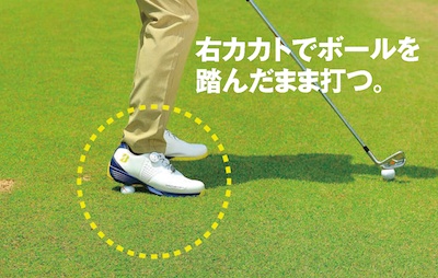 ボクがオススメしたいのは、打つ前にハーフスイングをしてヘッドの最下点を探すこと。ソールが芝を擦る位置を確認し、そこにボールがくるアドレスを基準として考えます。 ダウンブローで厚くインパクトしたければ、ソールが擦ったところより、 ボールがわずかに右にくるように構えるわけです。