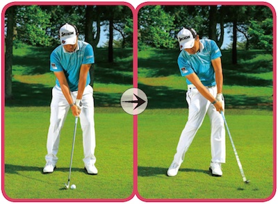 ダウンスイングで右腰が下がるとヘッドが下から入る。アマチュアがすくい打ちになって厚く当たらない原因はコレ。