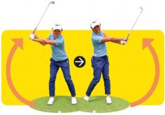 あまり大きく体を動かさない。クラブを自分でコントロールする意識をつけるために、トップは右手のヒラが正面を向くまで、フォローは、左手のヒラが正面を向くまで、を徹底して練習していました。