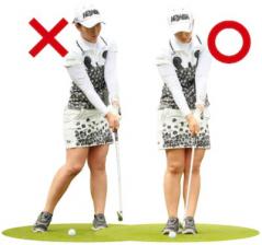 ヘッドを上から入れて力を伝えたいので、ハンドファーストに構えます。(左写真)