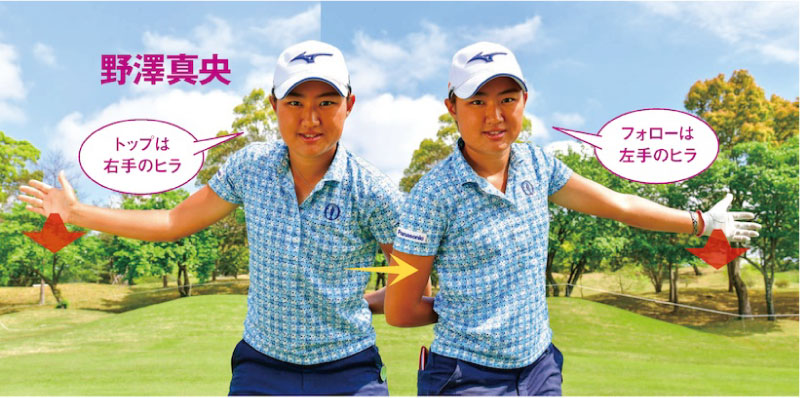 ハーフスイングとは、トップで右手のヒラ、フォローで左手のヒラが正面を向くまでの振り幅のこと。