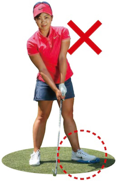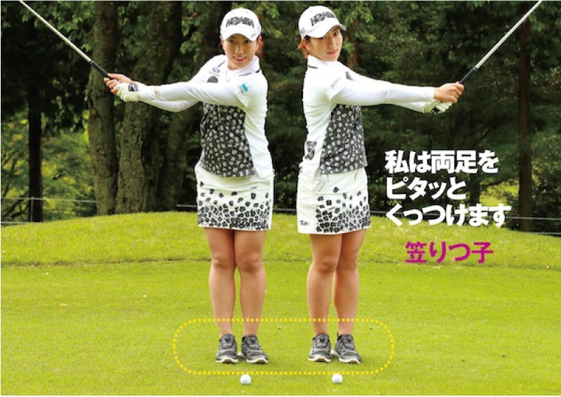 足を閉じてハーフスイングの練習をすることによって、体の傾きがインパクトを不安定なものにするということもよくわかるはずです。