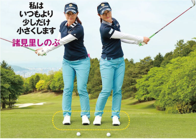 私の場合、ターフを取るようなインパクトではないですし、調子が悪くなってくると当たりが薄くなるんです。そんな時は、通常よりもスタンス幅を狭めてハーフスイングをします。