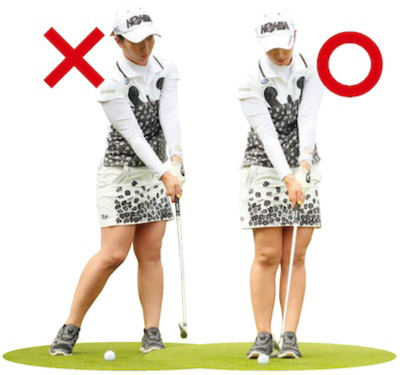 ヘッドを上から入れて力を伝えたいので、ハンドファーストに構えます。(左写真)
