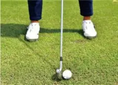 スタンス幅を狭めたほうが、クラブの動きを管理しやすいですし、大振りしにくくなるので、芯でボールをとらえやすくなります。ボールの重さを感じられる、いいインパクトの感触を思い出すことが目的なので、ボールに当てやすい構えをします。