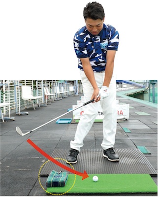 タオルをボールの手前に置いて練習することで、なるべくタオルに当てないような意識を持 つことができ、クラブヘッドは上からの軌道でボールに向かっ ていく。まずは、この練習方法で意識を改善して、あおり打ちからゆるやかダウンブローを目指しましょう。