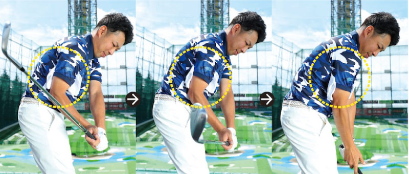 2つ目は、インパクトの瞬間に右ワキが開いてしまうこと。開いてしまうことによって、なぜダフっているアイアンショットになってしまうのだろう?