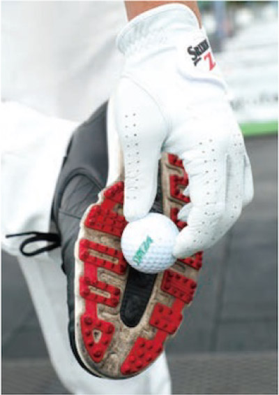 ボールを右足で踏むと、インサイドに上げた時にさらにカカトに体重がいってしまうので、 バランスを保つことができない。ボールを踏んだ状態で、バランスを保とうとすることで ヘッドはオンプレーンになり、 正しいヘッド軌道を知ることができる。