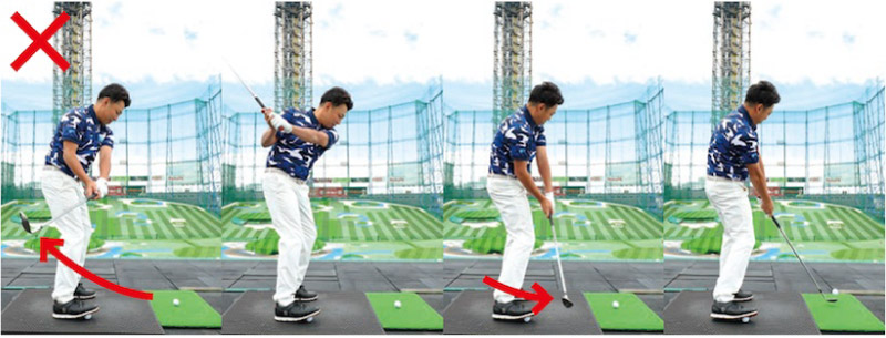 テークバックをインサイドに引いてしまうと、アイアンショットではヘッドの重さがあるため、そのままインサイドから下りてきてしまう。インサイドから下りてくるとヘッドは下から入ってしまうから、ダフリショットになってしまう。