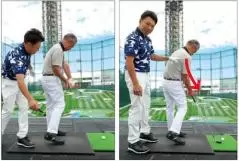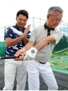 そうすると、ダウンスイングでヘッドの重さで手元が下がり、地面にヘッドが当たってしまいます。タオルを挟む意味を理解して、練習してみましょう。