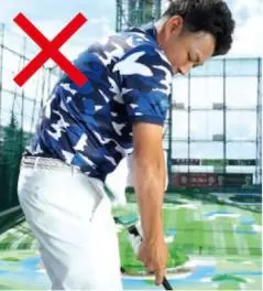 ヘッドが先にマットに当たる原因の1つ目は、ダウンスイングのアーリーリリース。アーリーリリースになるということは、ヘッドがダウンスイングで手元よりも下に行ってしまい、ヘッドの軌道が自動的にあおり打ちになってしまう。