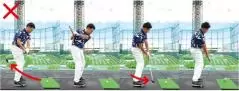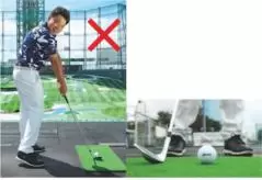 一方、濁音が先に聞こえて しまう場合。このようなケースは先にマットにヘッドが当 たり、ダフっていてもマットなので、そのままヘッドは横滑りしてボールに当たります。これだと実際にコースに出てアイアンショットをした時に、地面を掘って大ダフリになってしまいます。
