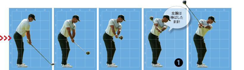 ❶ バックスイングでは昔から左腕を一切曲げないで上半身を捻転させているので、早い段階でプレーン上にシャフトを乗せられる。