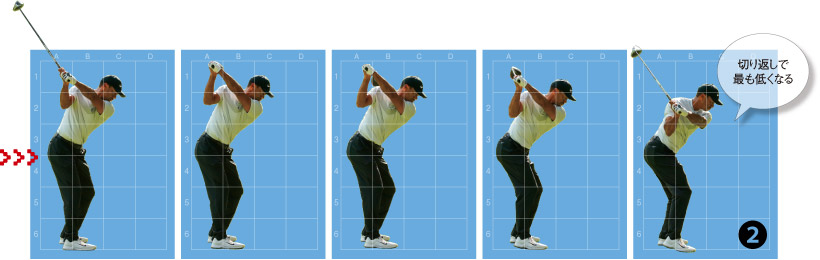 ❷ トップから切り返しの瞬間に頭の位置は最も低くなり、沈み込んだ姿勢になる。シャフトに理想的な傾斜をつけることができる。