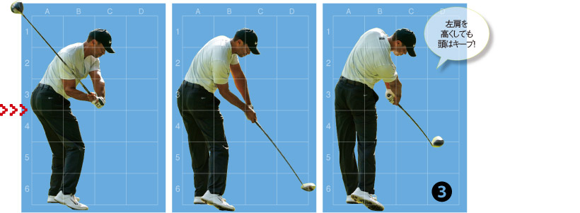 ❸ 左肩が上がっても頭の位置は変わっていないので、上半身が背中を軸にしてスムーズに回転できる。頭の位置が変わると軸がブレる。