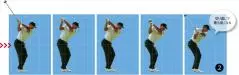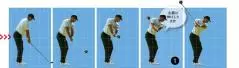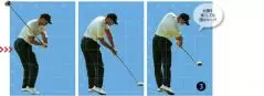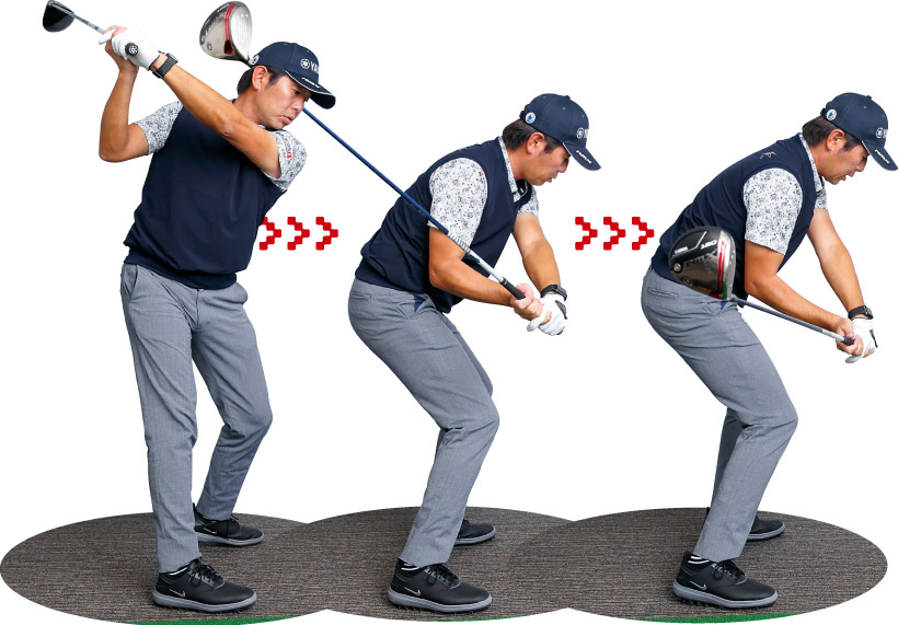 ダウンスイングでは一度、体全体を沈みこませて、インパクトからフォローにかけては左肩を上げる動きによって、ヘッド軌道がプレーン上を動きやすくなる。インパクトで左肩が低いままだと、窮屈な姿勢になって、手首でヘッドを返しやすくなる。
