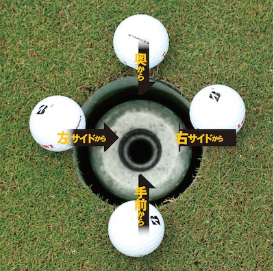 例えば、カップの入り口というのは、手前からの1つだけではありません。ボールがカップの右サイドから入ることもあれば、左サイドから入ることもある。強めに打つことで、カップの奥の土手に当たって裏側(反対側)から入ることもあります。