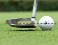 一般的に、アドレスでパターのソールを地面につけると、ボールの芯よりもフェースの芯のほうが低い位置になります。芯と芯を合わせるには、インパクトまでに高さを調節しなければいけません。 この高さのズレを認識しながら、フェースの芯でボールの芯を打ってみてください。